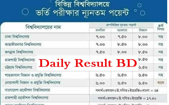 জেনে নিন কোন বিশ্ববিদ্যালয়ে ভর্তি পরীক্ষায় কত পয়েন্ট লাগবে ২০২২ / রেজাল্ট অনুযায়ী দেখে নাও কোন কোন ভার্সিটিতে পরীক্ষা দিতে পারবে তা নিয়ে আজকে আলোচনা করা হবে www Daily Result BD com bangla ওয়েসাইটে। All University Admission Test Required GPA List 2020-2021 Session Has Been Published on Daily Result BD com Bangla Website.