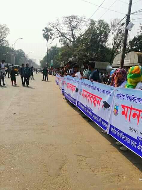 মানববন্ধনে জাতীয় বিশ্ববিদ্যালয় ছাত্র ঐক্য পরিষদের কেন্দ্রীয় যুগ্ম আহ্বায়ক মো. রহমাতুল্লাহ বলেন, জাতীয় বিশ্ববিদ্যালয় শুরু হওয়ার পর থেকে আমরা শোষণের শিকার হয়ে আসছি। আমাদের সর্বশেষ সমাবর্তন হয়েছিল ২০০০ সালে। তাও ছিল অসম্পূর্ণ। আমরা সারাবিশ্বের দ্বিতীয় বৃহৎ বিশ্ববিদ্যালয় হওয়ার পরও বঞ্চনার শিকার হচ্ছি। আমরা এর থেকে মুক্তি চাই। আমরা আন্দোলন করতে চাই না, পড়ার টেবিলে ফিরে যেতে চাই। তাই অতি দ্রুত আমাদের পাঁচ দফা দাবি মেনে নেওয়া হোক।